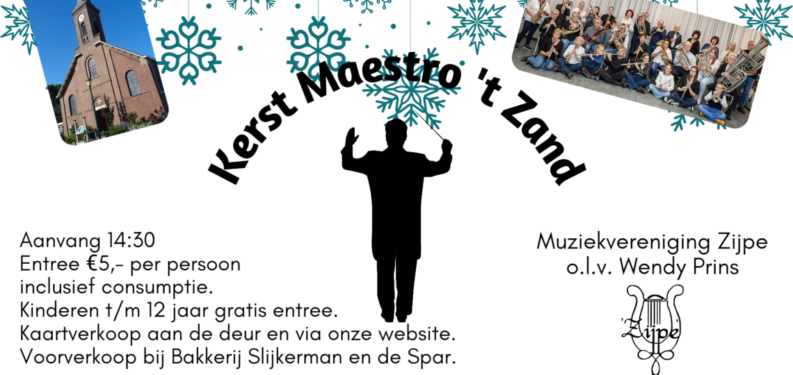 Zondag 15 december gaan 4 dappere gastdirigenten de uitdaging aan om ons Harmonieorkest te leiden tijdens het Kerst Maestro Concert in de sfeervolle kerk van ‘t Zand. Wie van hen wint de gouden baton? Het oordeel is aan de jury en aan jou als publiek. De deuren gaan open om 14:00 en we starten om 14:30.Entree is 5 euro per persoon inclusief een consumptie in de pauze. Kinderen tot en met 12 jaar mogen gratis naar binnen. Mis het niet! Een middag vol muziek, gezelligheid en kerstsfeer.